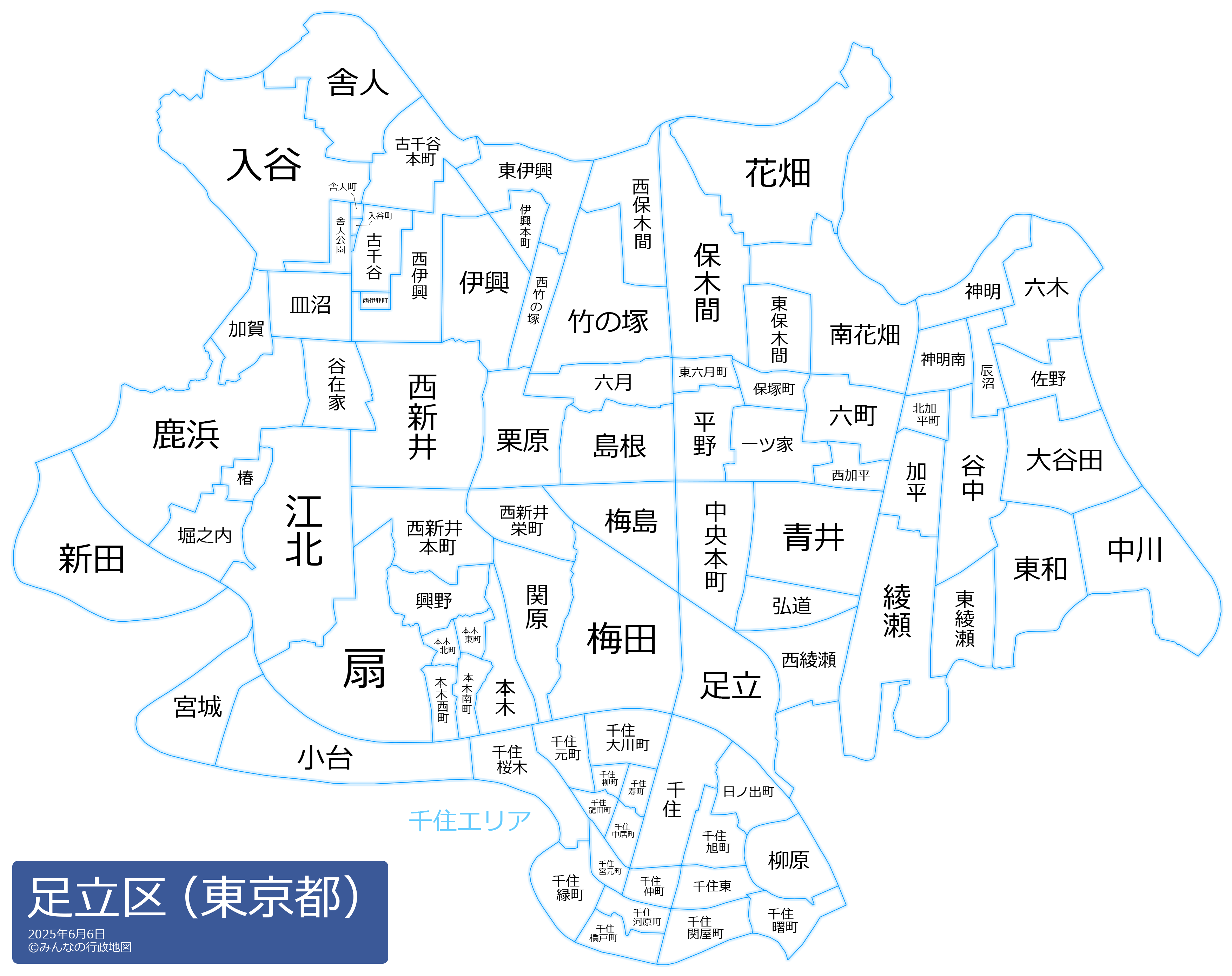 青井(あおい)足立(あだち)綾瀬(あやせ)伊興(いこう)伊興本町(いこうほんちょう)入谷(いりや)入谷町(いりやまち)梅島(うめじま)梅田(うめだ)扇(おうぎ)大谷田(おおやた)興野(おきの)小台(おだい)