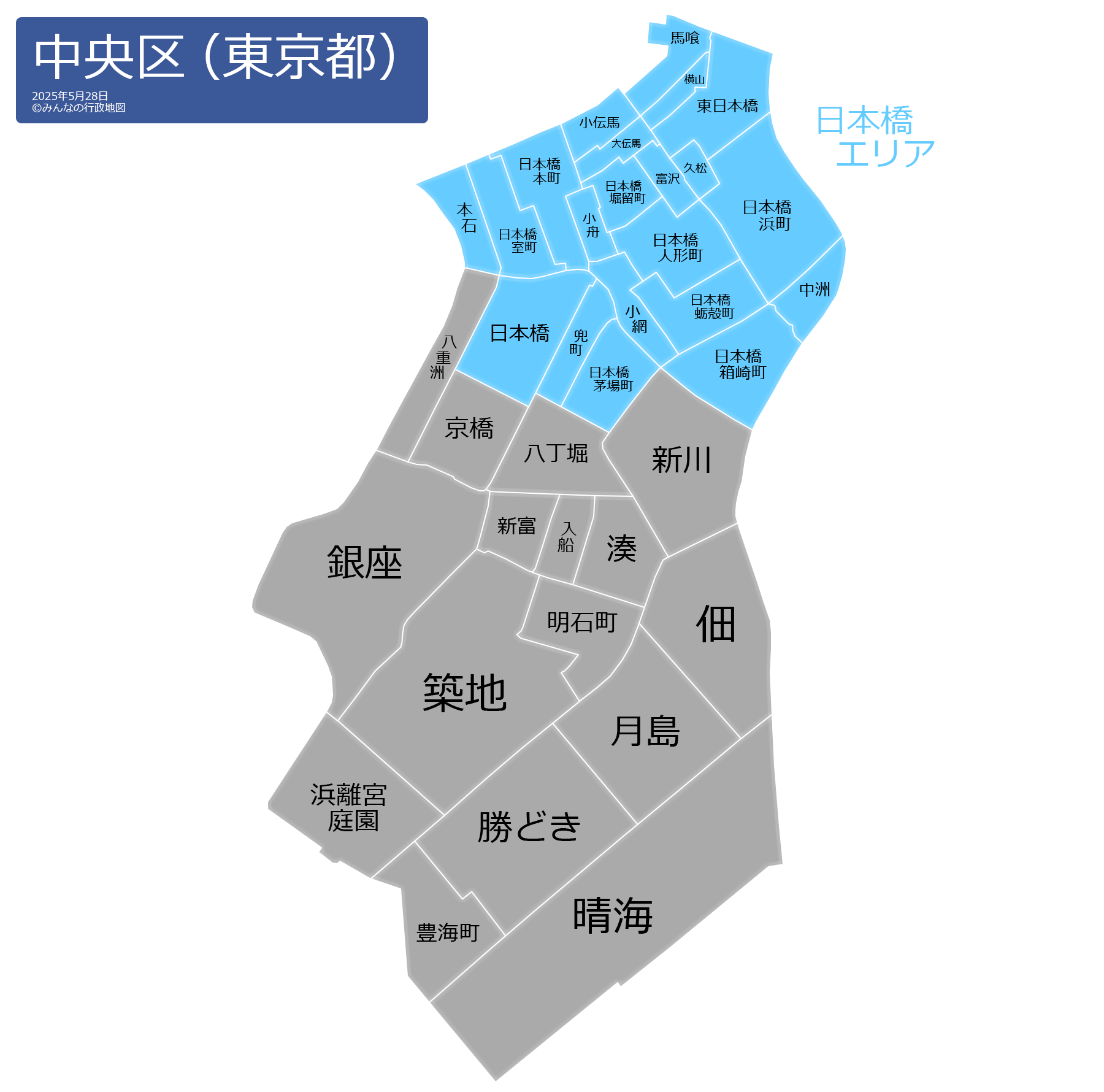 日本橋(にほんばし)日本橋大伝馬町(にほんばしおおでんまちょう)日本橋蛎殻町(にほんばしかきがらちょう)日本橋兜町(にほんばしかぶとちょう)日本橋茅場町(にほんばしかやばちょう)日本橋小網町(にほんばしこあみちょう)日本橋小伝馬町(にほんばしこでんまちょう)日本橋小舟町(にほんばしこぶなちょう)日本橋富沢町(にほんばしとみざわちょう)日本橋中洲(にほんばしなかす)日本橋人形町(にほんばしにんぎょうちょう)日本橋箱崎町(にほんばしはこざきちょう)日本橋浜町(にほんばしはまちょう)日本橋馬喰町(にほんばしばくろちょう)日本橋久松町(にほんばしひさまつちょう)日本橋堀留町(にほんばしほりどめちょう)日本橋本石町(にほんばしほんごくちょう)日本橋本町(にほんばしほんちょう)日本橋室町(にほんばしむろまち)日本橋横山町(にほんばしよこやまちょう)