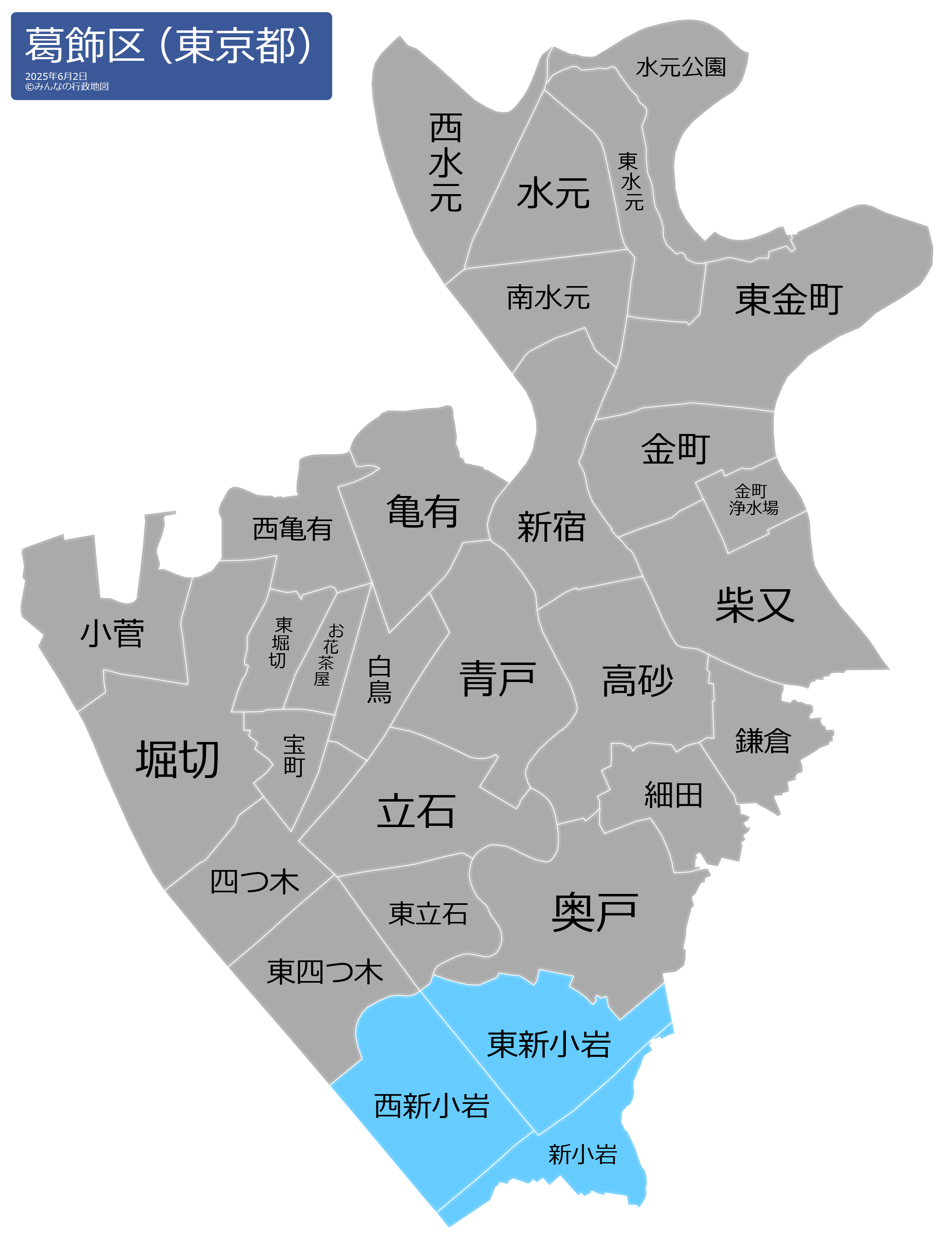 東金町(ひがしかなまち)東新小岩(ひがししんこいわ)東立石(ひがしたていし)東堀切(ひがしほりきり)東水元(ひがしみずもと)東四つ木(ひがしよつぎ)細田(ほそだ)堀切(ほりきり)