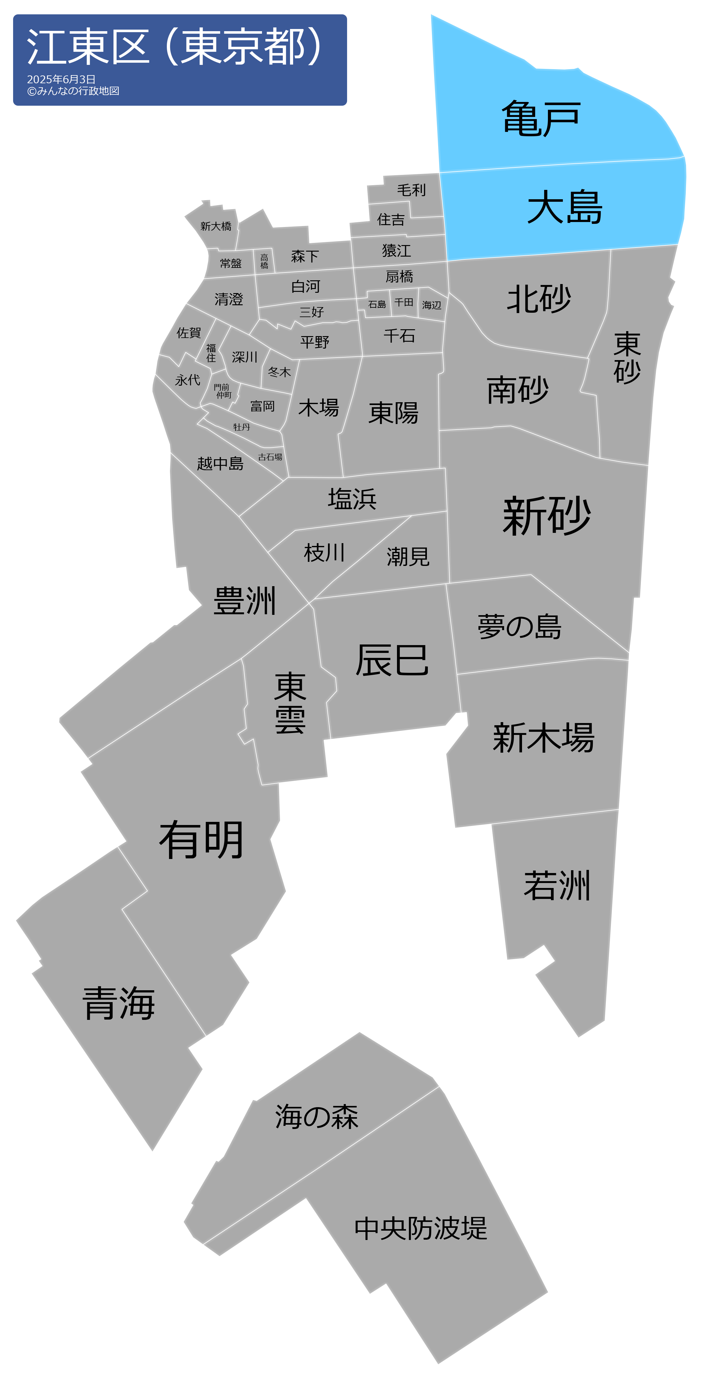 亀戸(かめいど)北砂(きたすな)木場(きば)清澄(きよすみ)
