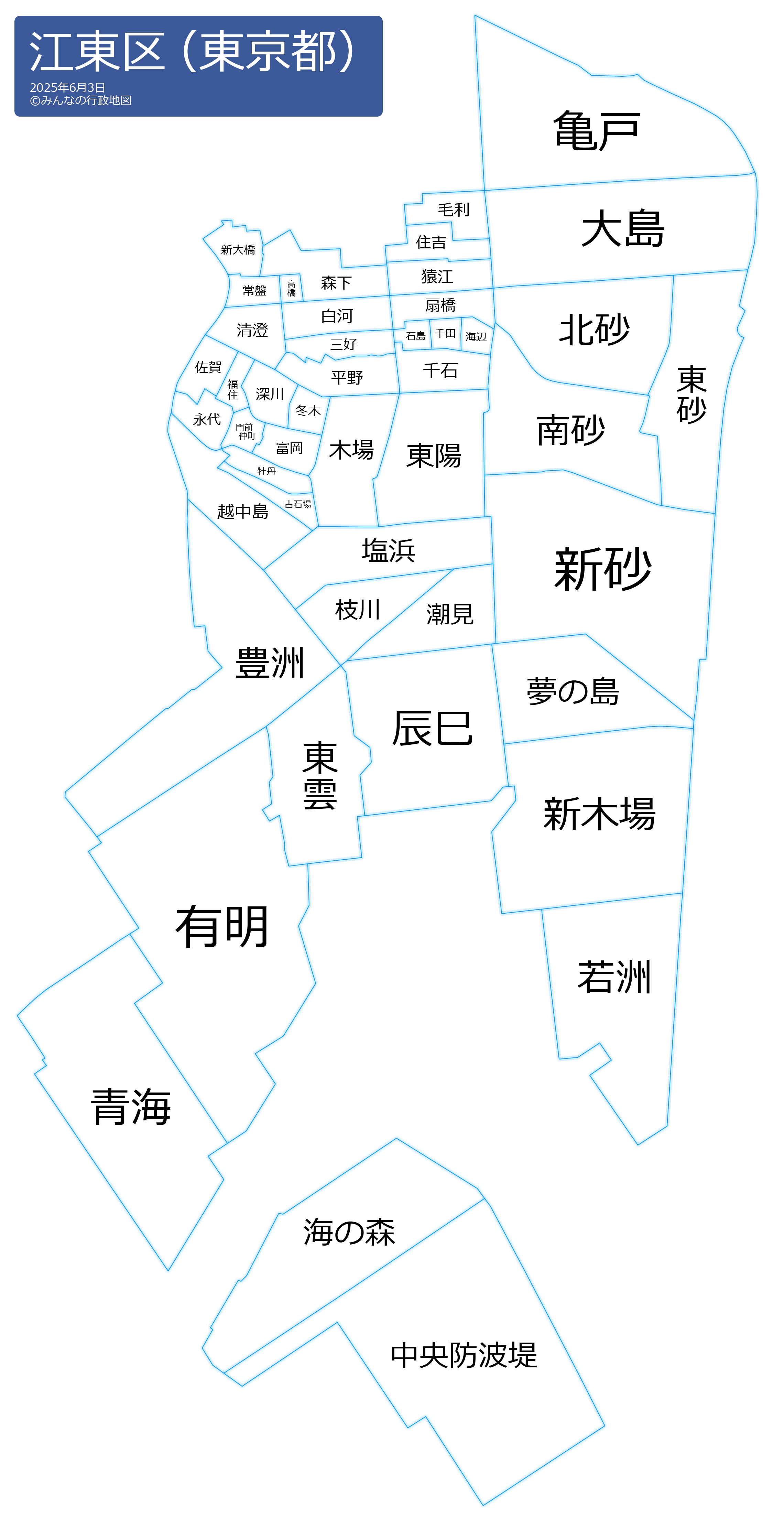 青海(あおみ)有明(ありあけ)石島(いしじま)海の森(うみのもり)海辺(うみべ)永代(えいたい)枝川(えだがわ)越中島(えっちゅうじま)扇橋(おうぎばし)大島(おおじま)