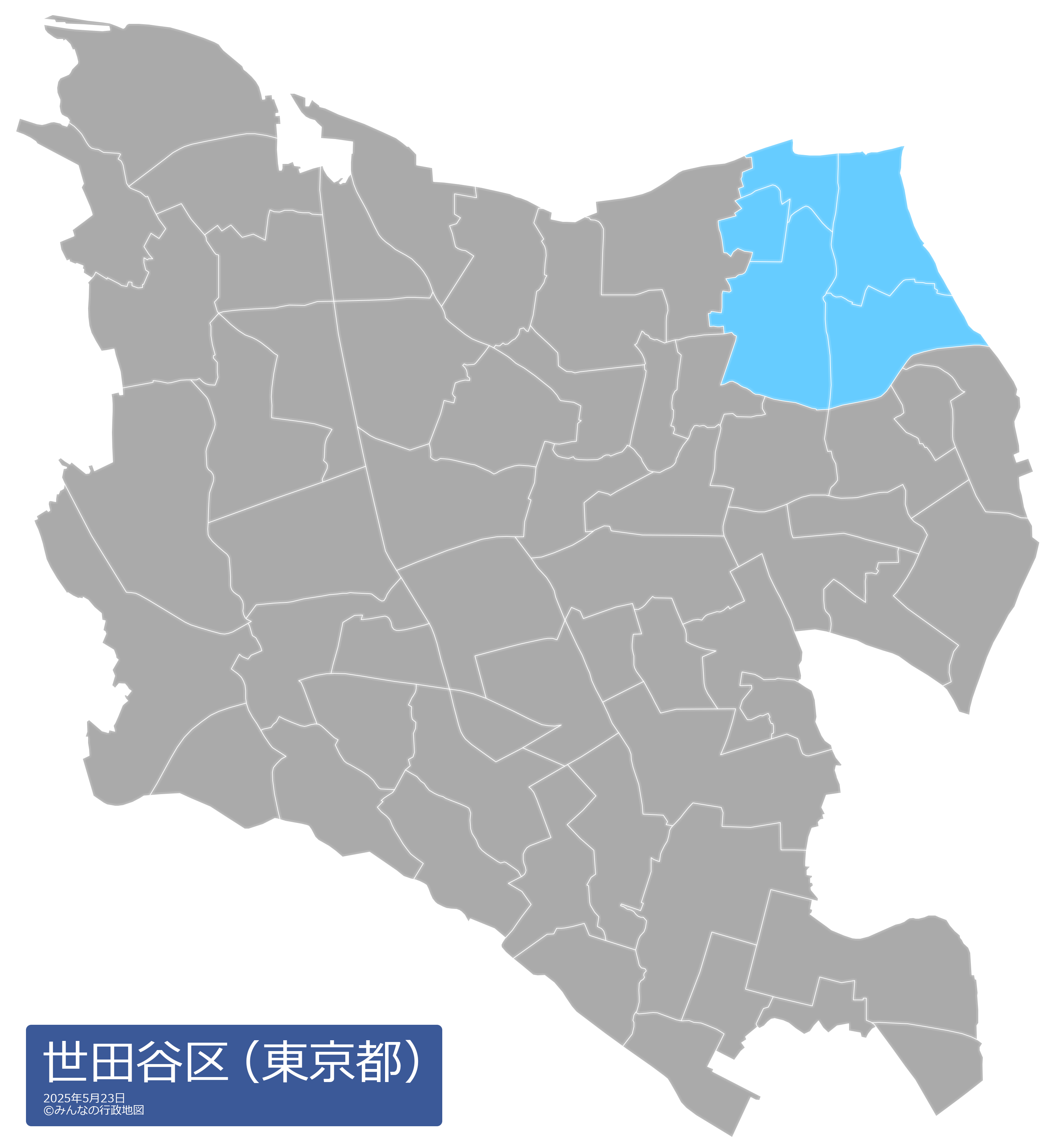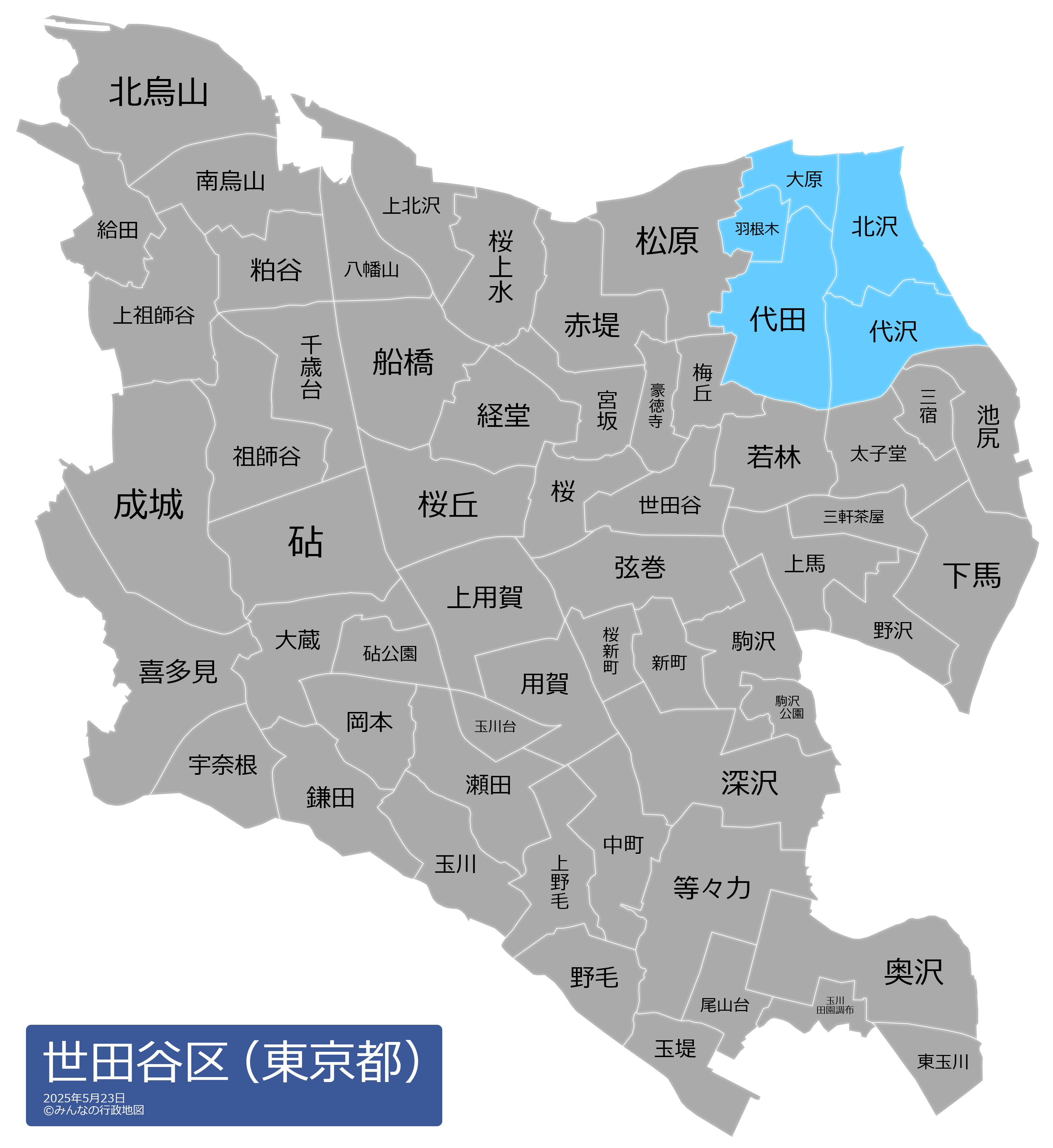 粕谷(かすや)鎌田(かまた)上馬(かみうま)上北沢(かみきたざわ)上祖師谷(かみそしがや)上野毛(かみのげ)上用賀(かみようが)北烏山(きたからすやま)北沢(きたざわ)喜多見(きたみ)砧(きぬた)砧公園(きぬたこうえん)給田(きゅうでん)経堂(きょうどう)豪徳寺(ごうとくじ)駒沢(こまざわ)駒沢公園(こまざわこうえん)