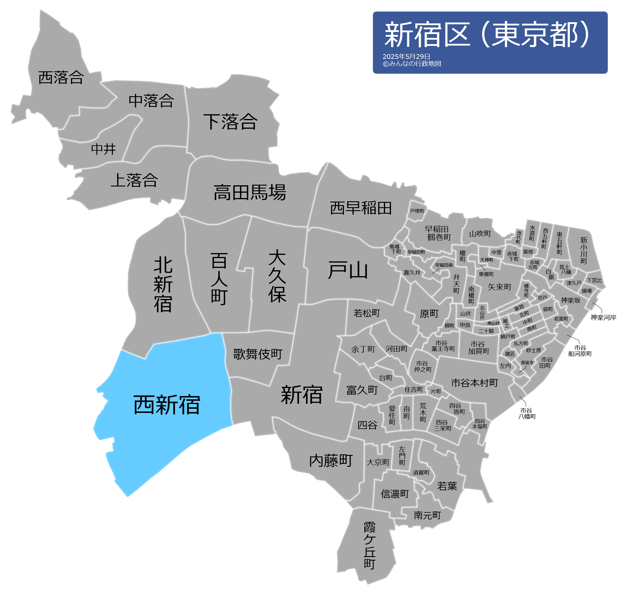 内藤町(ないとうまち)中井(なかい)中落合(なかおちあい)中里町(なかざとちょう)中町(なかちょう)納戸町(なんどまち)西落合(にしおちあい)西五軒町(にしごけんちょう)西新宿(にししんじゅく)二十騎町(にじゅつきまち)西早稲田(にしわせだ)